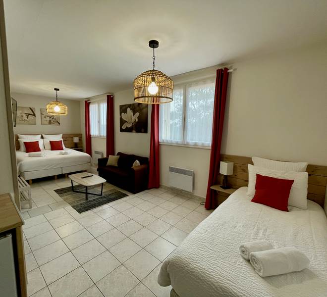 Chambre de 33m² Pour 3 PersonnesPetits déjeuner inclus1 Lit Queen size1 Lit de 90Coin salon2 Salle d...